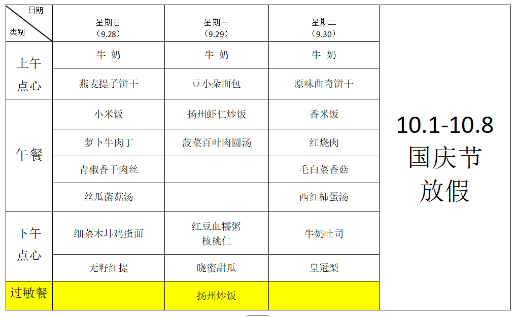 9月28日—9月30日幼儿食谱