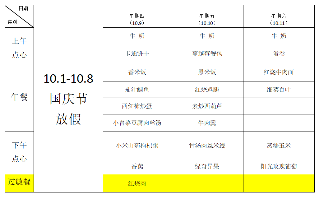 10月9日—10月11日幼儿食谱